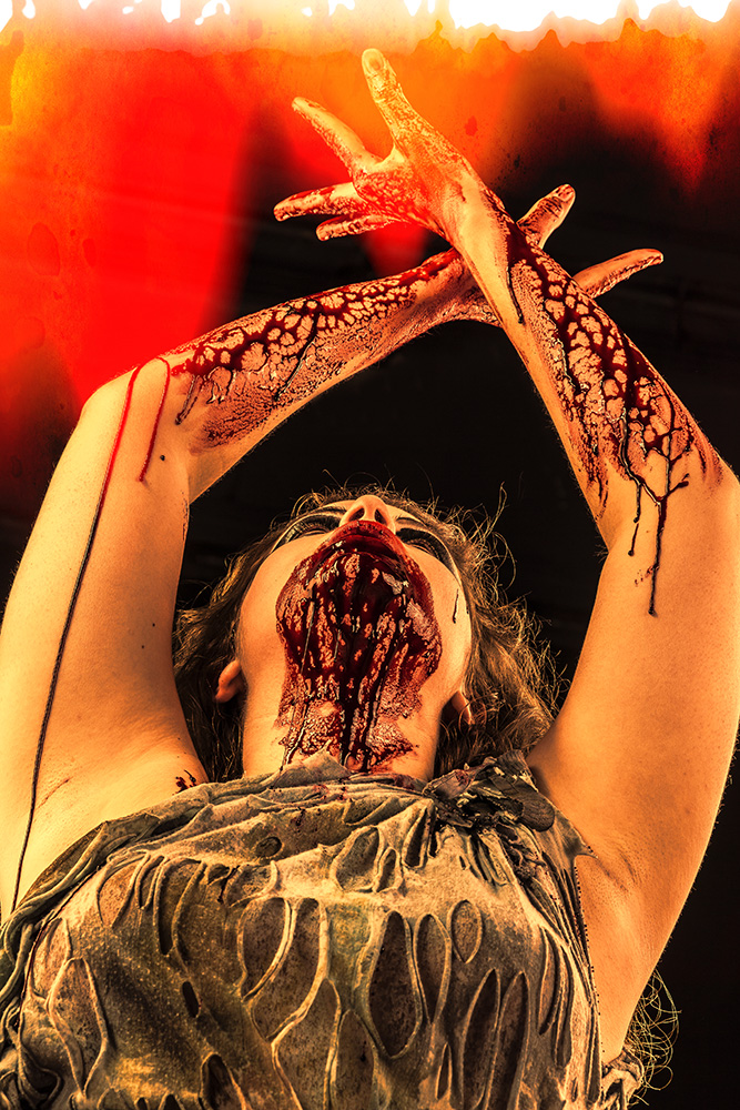 The interplay between actors and musicians in ELECTRA, all of whom are onstage for the approximately 90 minute production, is fascinating. “The musicians are members of the [classical Greek] Chorus,” Dr. Maniutiu said, “acting and playing as one single body, one single character.” The production’s Chorus is additionally comprised of a band of post-apocalyptic looking homeless warriors, bent on exacting Electra’s revenge. “The Chorus is, in fact, a dramatic amplification of the character Electra—a multifaceted character—acting as a single body…In a way they are Electra’s shadows, Electra’s resonators, and they are living as she does with the obsession of revenge.”