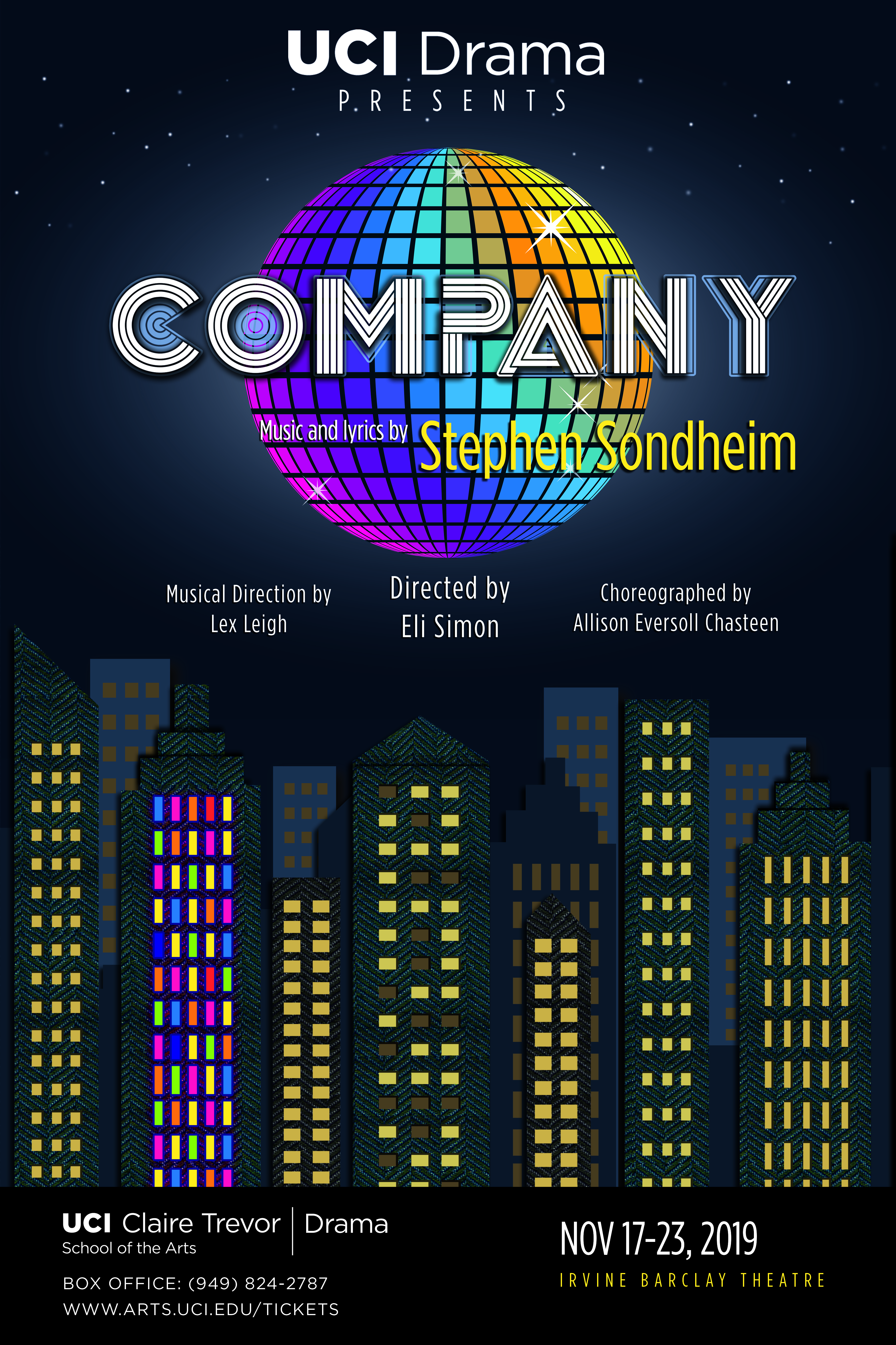 Irvine, Calif., October 31, 2019 – UC Irvine’s Claire Trevor School of the Arts (CTSA) Department of Drama opens its 2019-20 season with Stephen Sondheim’s Tony Award-winning 1970 musical comedy Company at the Irvine Barclay Theatre. The book, written by George Furth, tells the story of Robert, a confirmed bachelor who, on the night of his 35th birthday, contemplates his unmarried state. Throughout a series of several social events, his friends explain the pros and cons of taking on a spouse. Robert is forced to question his bachelorhood during a meaningful array of interactions. The show opens Sunday, Nov. 17, and closes on Saturday, Nov. 22, 2019, offering both matinee and evening performances.